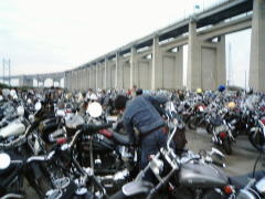 広い橋の一番外のレーンをゆっくり走りながら遥か下に見える海を渡る。